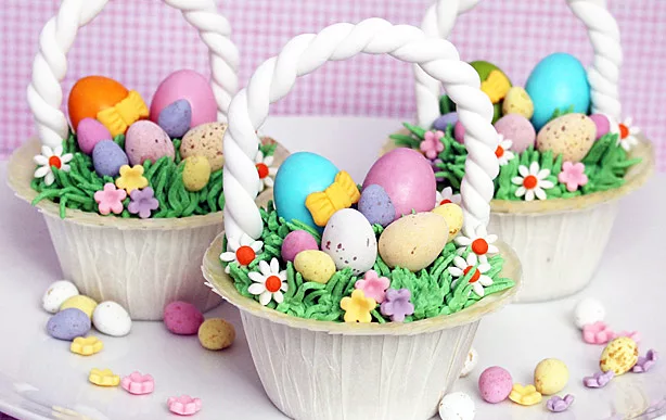 These adorable Easter basket cupcakes are much easier to make than they look. Make the fondant basket handles a few days before the cupcakes are needed to give them time to dry and harden then decorate with frosting, flowers and yummy Easter eggs. Click here to find out more.